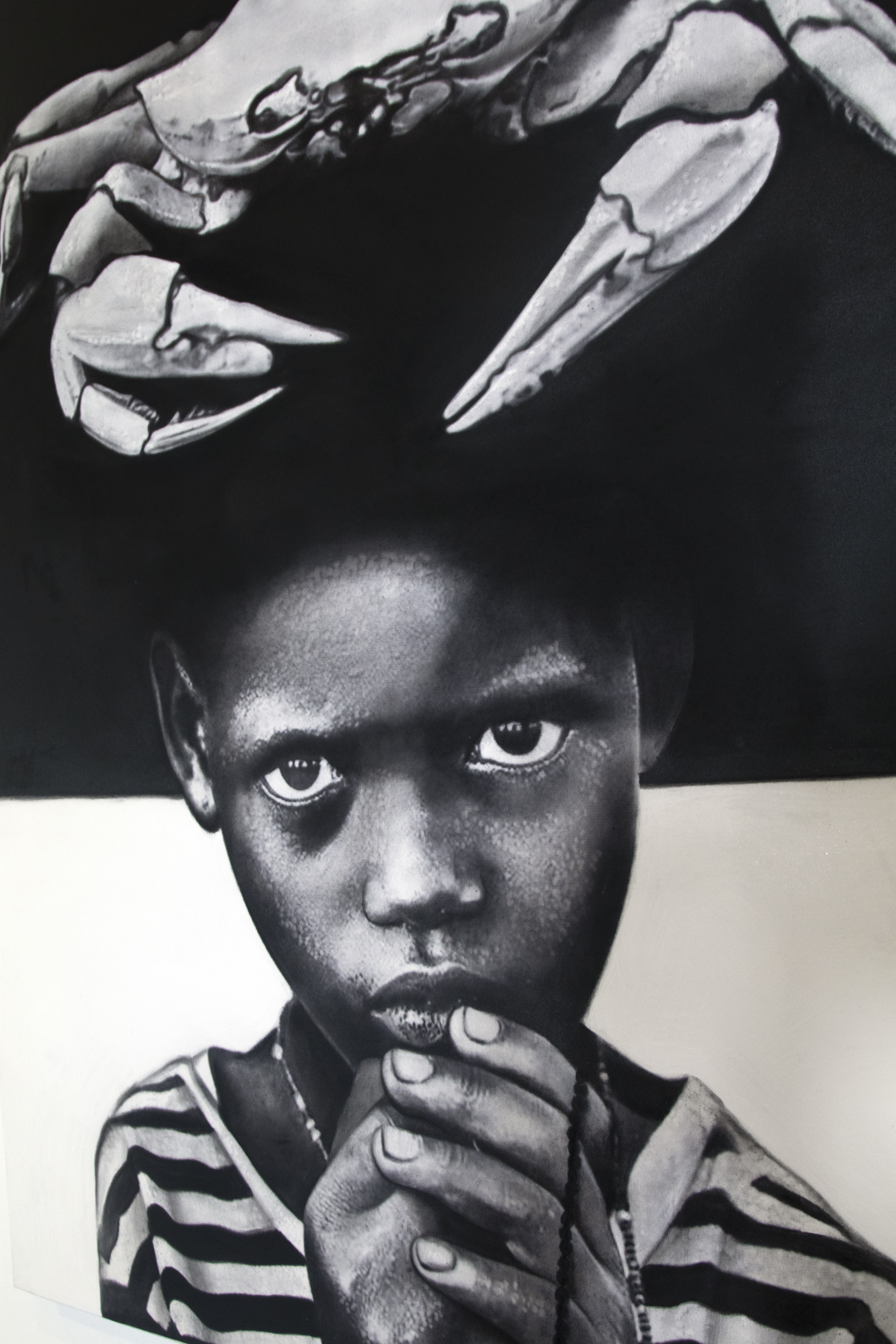 Description: The charcoal drawing technique of Yosvany Arango is combined with other techniques, such as airbrushing, to achieve a high level of detail in the canvas texture.