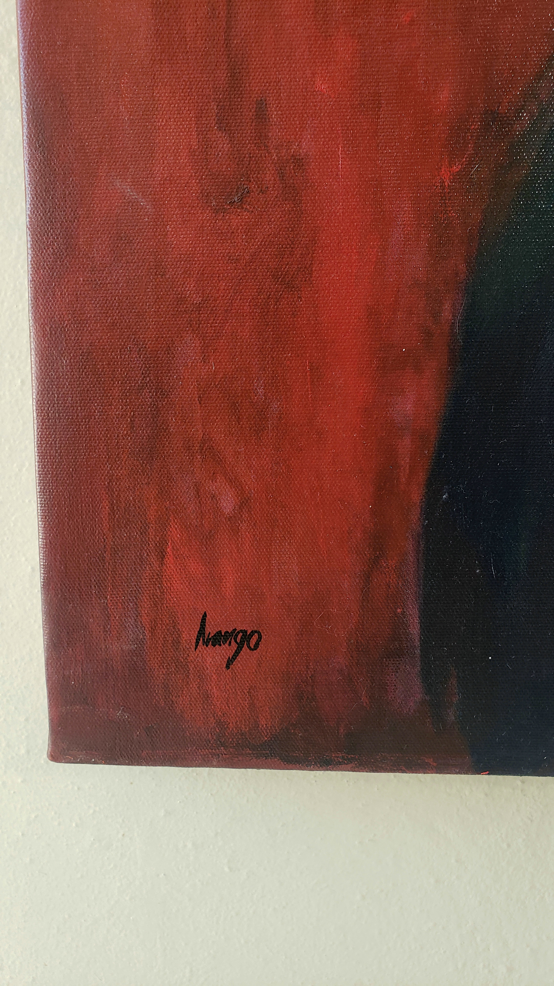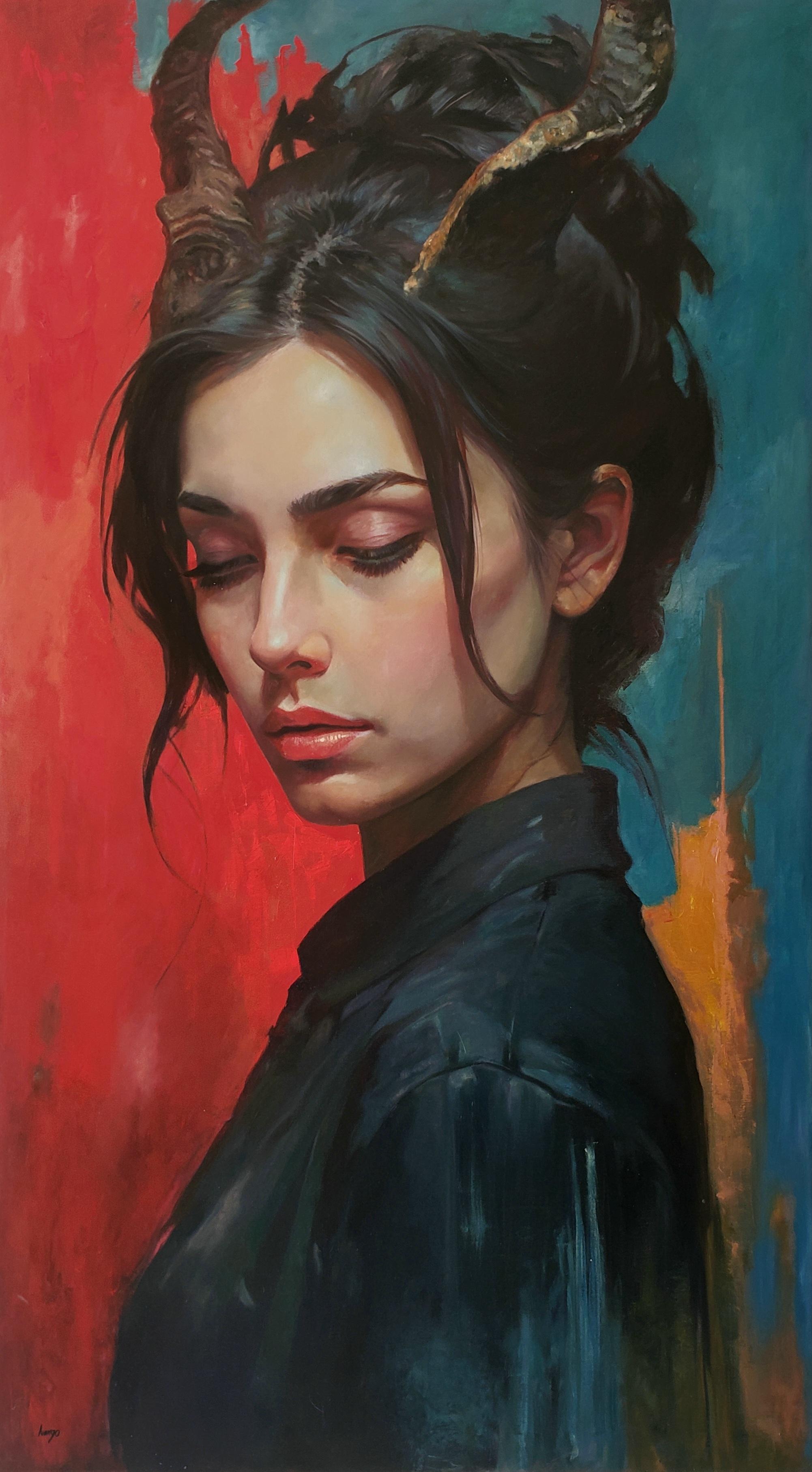 Description: On a canvas of dreams and emotions, the nymph with horns is portrayed, like an enigma in the firmament. Her closed eyes reflect a universe of mysteries and whispers, while her beauty shines like an angel in the twilight. In the background of turquoise blue and intense red, the contrasts of her being intertwine, like the sky embracing the fire, a duality that captivates and bewilders at the same time. Her presence is a wordless poem, a melody that glides through the corners of the soul, a whisper of light that leads us to explore the labyrinths of love and life.
