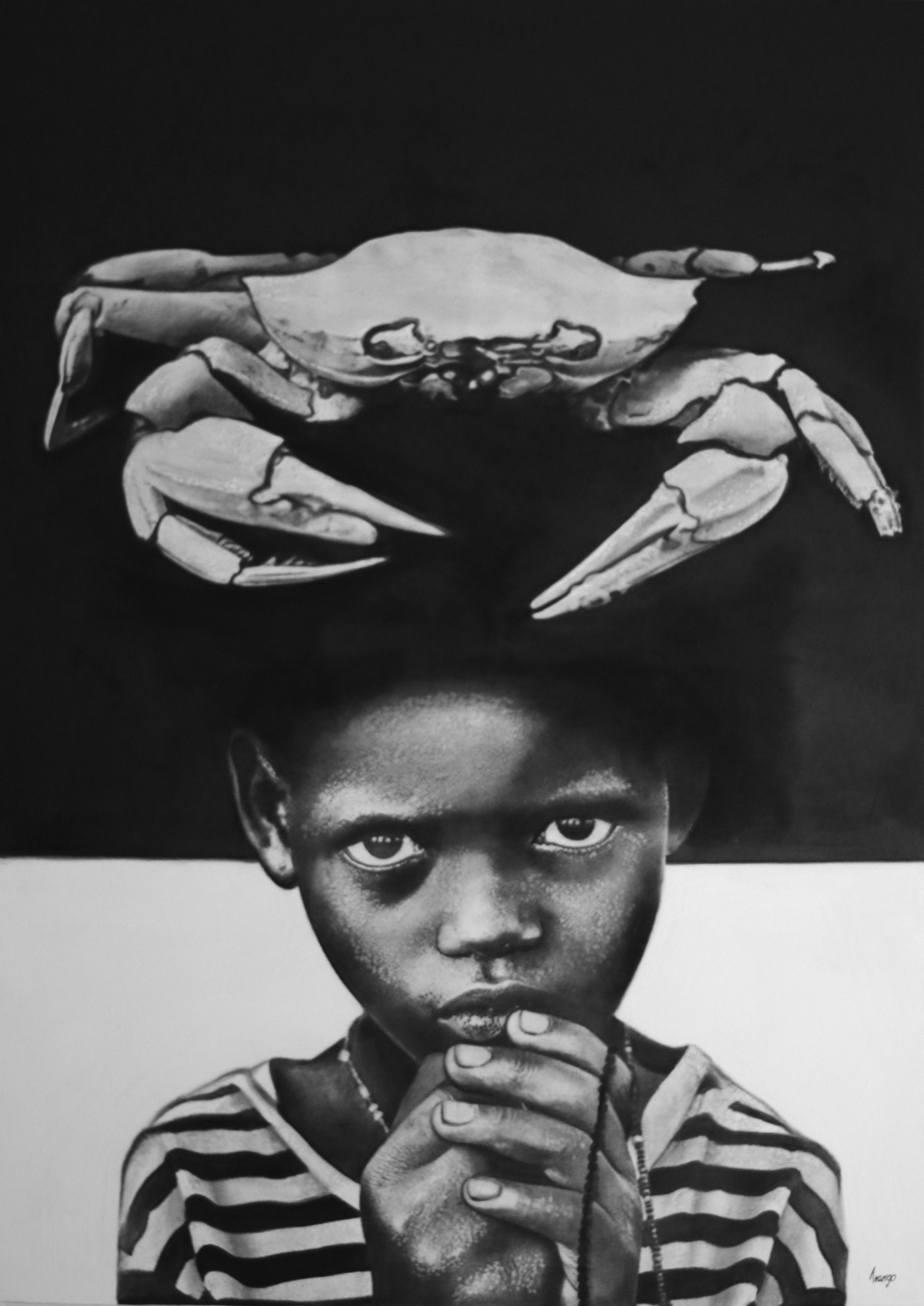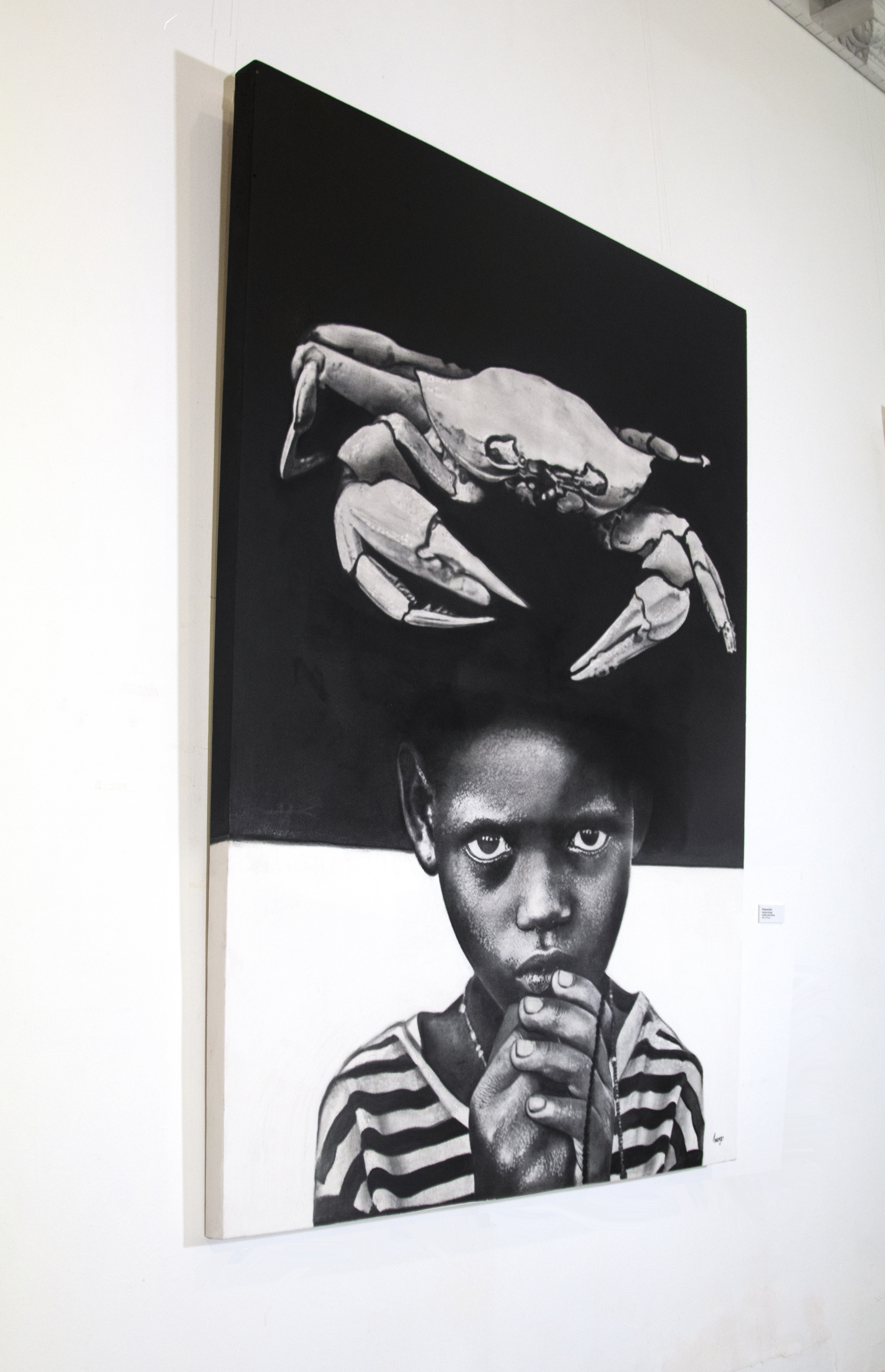 Description: The charcoal drawing technique of Yosvany Arango is combined with other techniques, such as airbrushing, to achieve a high level of detail in the canvas texture.