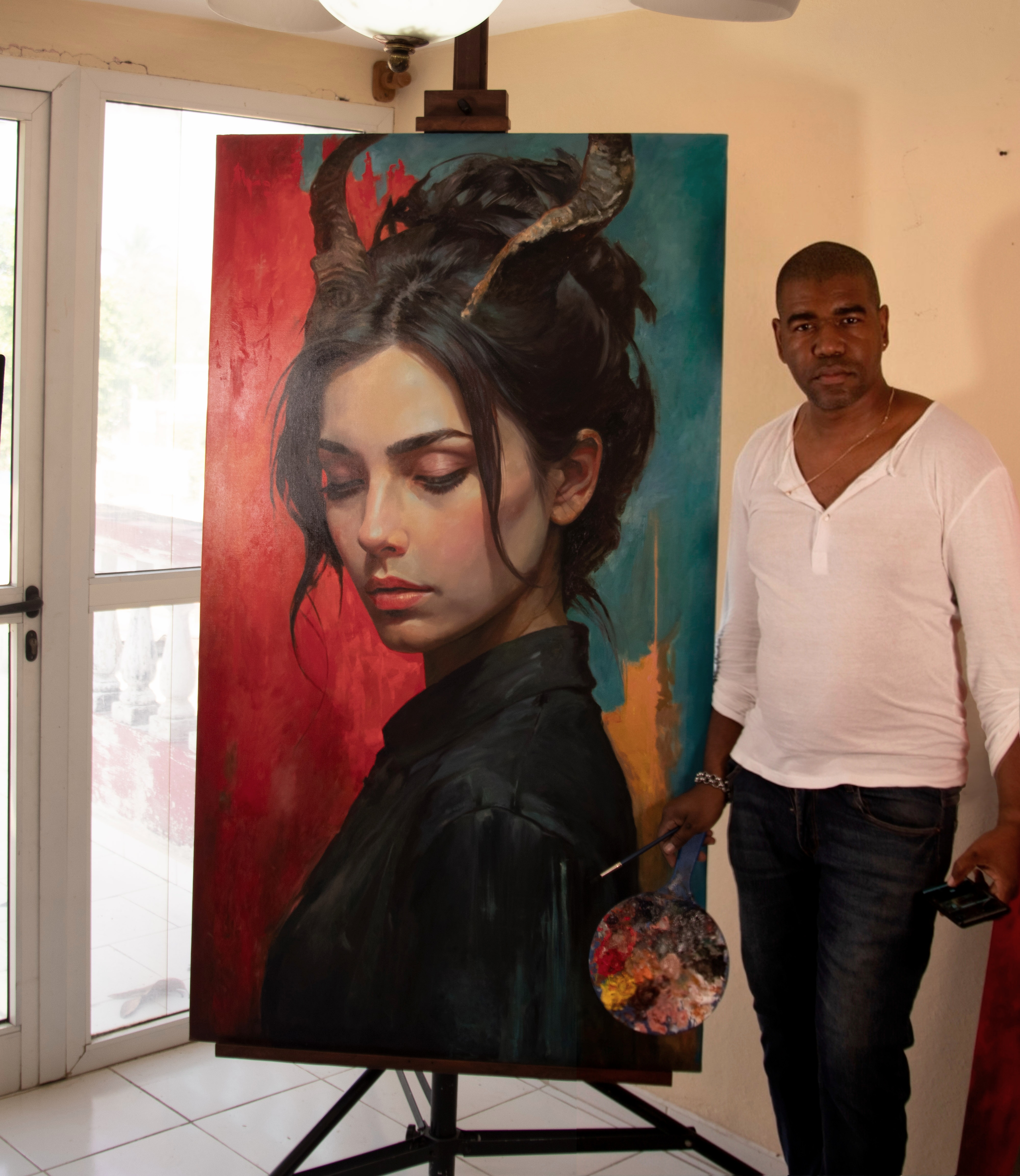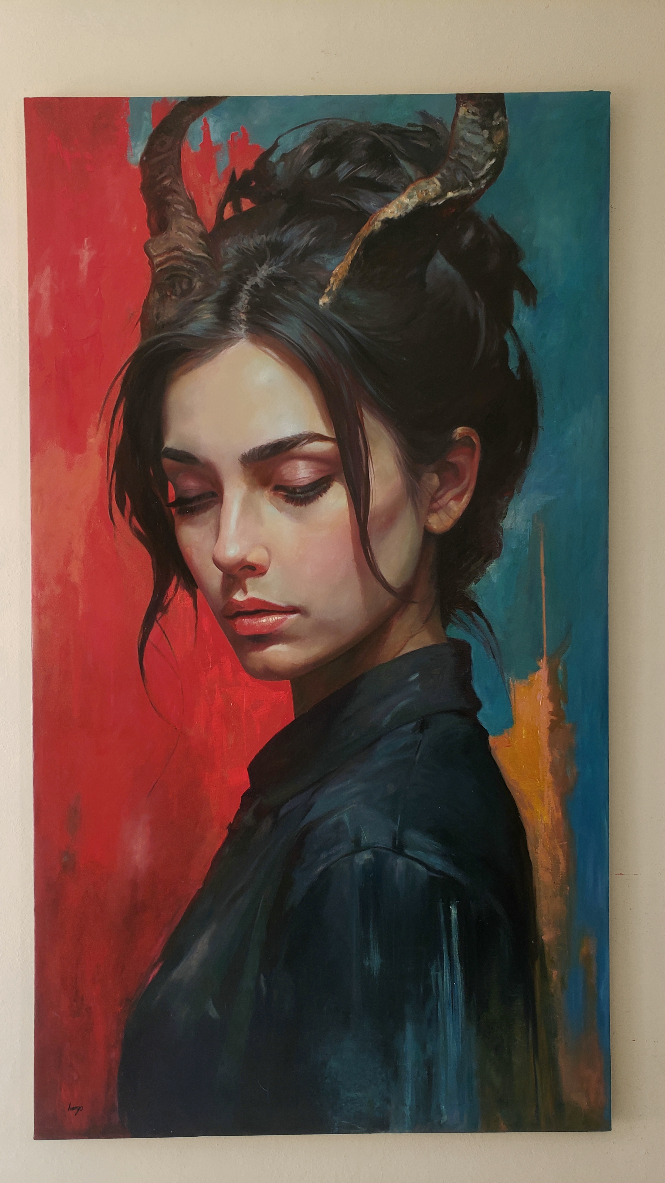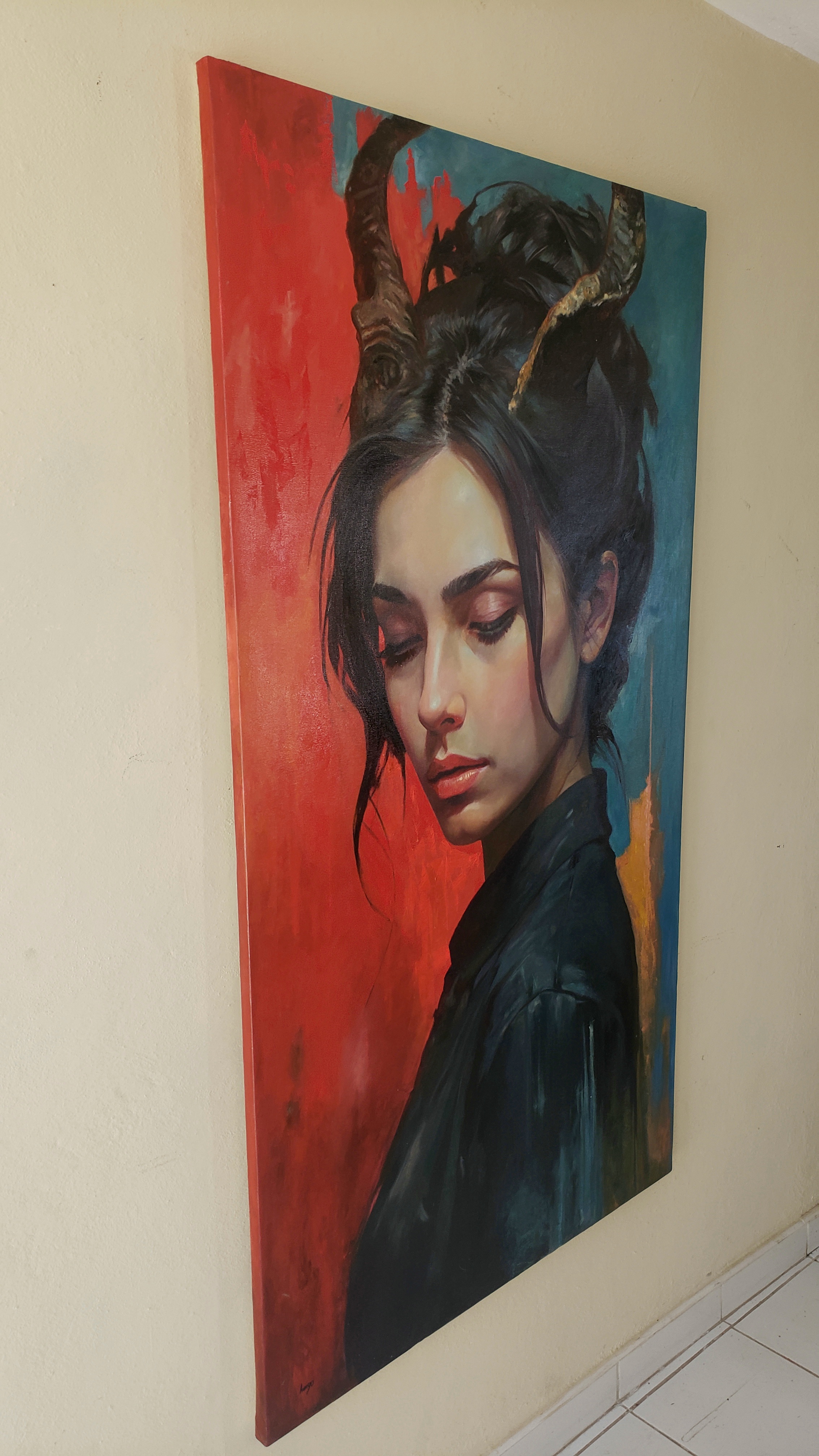 Description: On a canvas of dreams and emotions, the nymph with horns is portrayed, like an enigma in the firmament. Her closed eyes reflect a universe of mysteries and whispers, while her beauty shines like an angel in the twilight. In the background of turquoise blue and intense red, the contrasts of her being intertwine, like the sky embracing the fire, a duality that captivates and bewilders at the same time. Her presence is a wordless poem, a melody that glides through the corners of the soul, a whisper of light that leads us to explore the labyrinths of love and life.